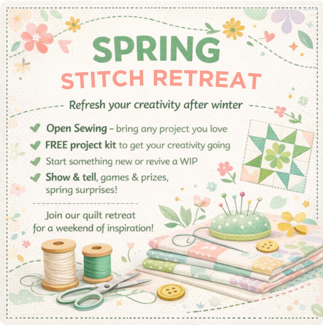 Shake off the winter slump and breathe new life into your sewing! Spring Stitch Retreat is the perfect weekend to reset, recharge, and rediscover your creative spark in a bright, modern, feel-good atmosphere.